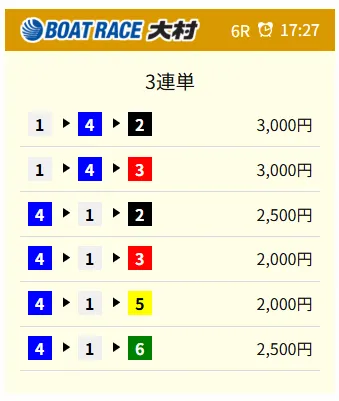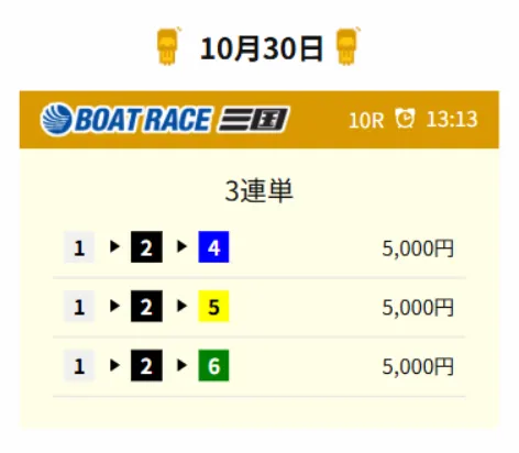 無料予想で舟券代1.5万円想定は高め。ほぼ6点買いなので1点当たりの賭け金が高く、回収金が高い。