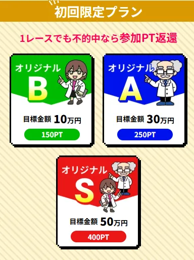 | オリジナルA | 15,000円 | 30万円 | 3連単2レース | 2~10点 | 250PT | 初回限定プラン |