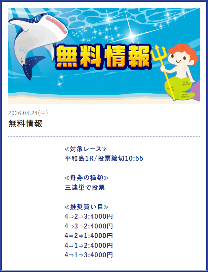 平和島競艇で今日4月24日(金)行われる競艇レースの無料予想を掲載しております。