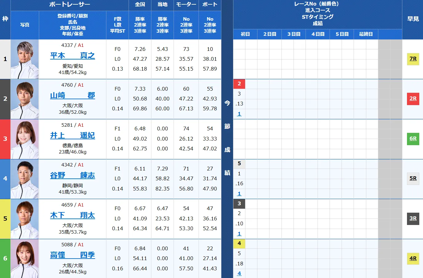 選抜戦の1号艇は平本真之が選ばれた!枠番別過去10走は6勝と最近少し勝ててない印象もある