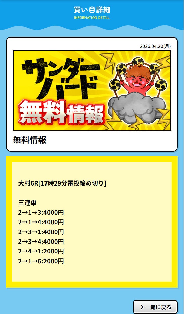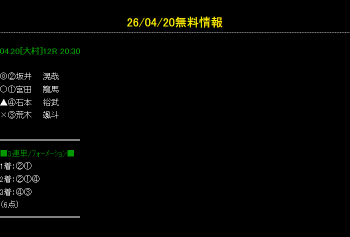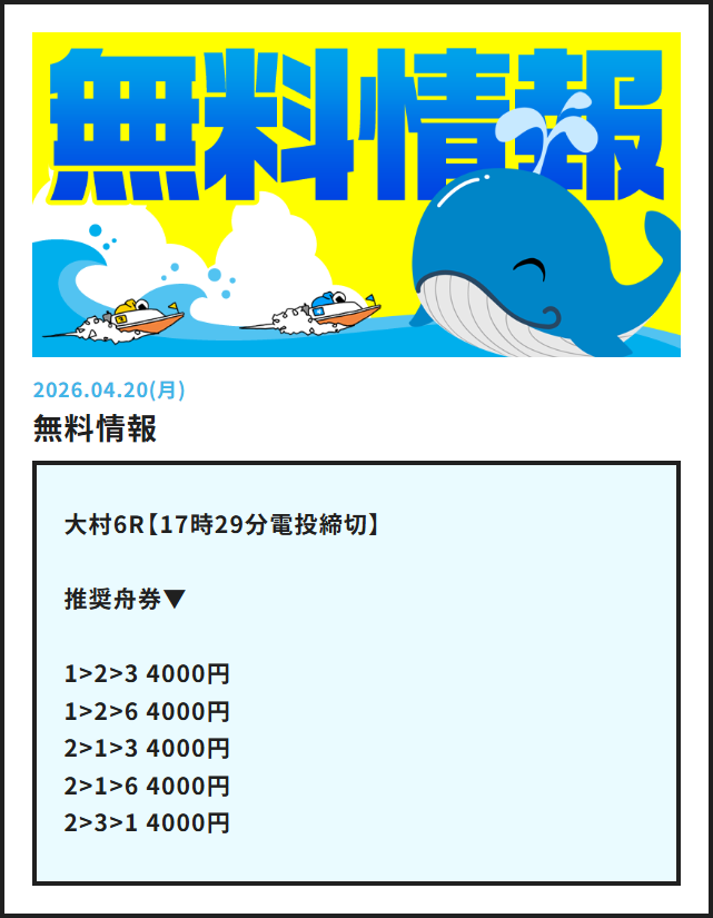 大村競艇で今日4月20日(月)行われる競艇レースの無料予想を掲載しております。