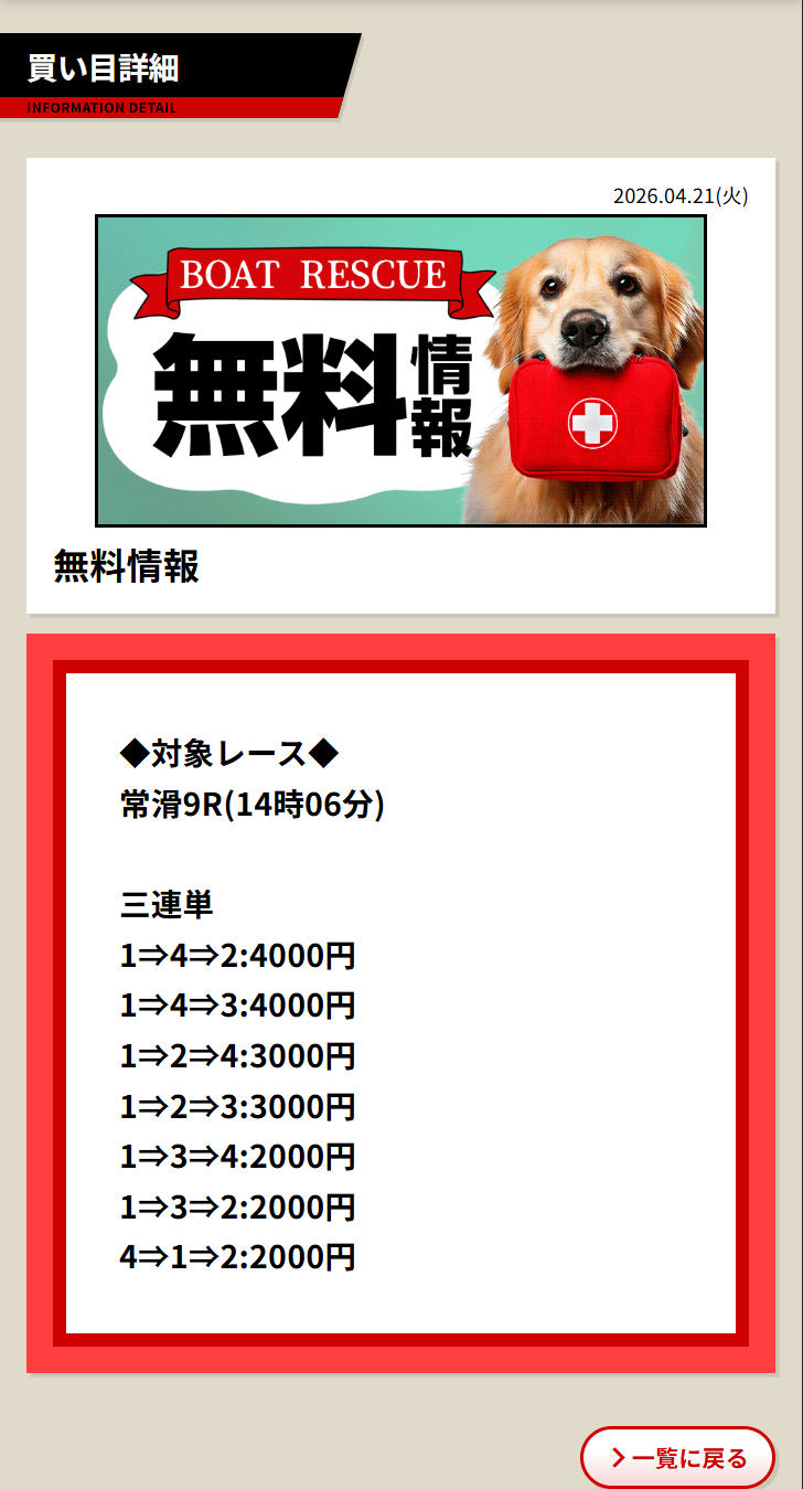 常滑競艇で今日4月21日(火)行われる競艇レースの無料予想を掲載しております。