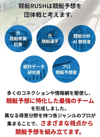 全体的にユーザビリティが高く、安全性にも問題がない「競艇ラッシュ」は、競艇予想を団体戦と捉え、様々なコネクションや情報網から結成された最強チームで予想を行っている競艇予想サイトだ。