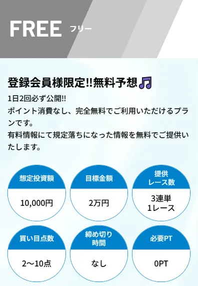 | プラン名 | 提供レース数 | 提供券種 | 買い目点数 | 想定投資額 | 目標獲得金額 | 必要PT | 備考 |