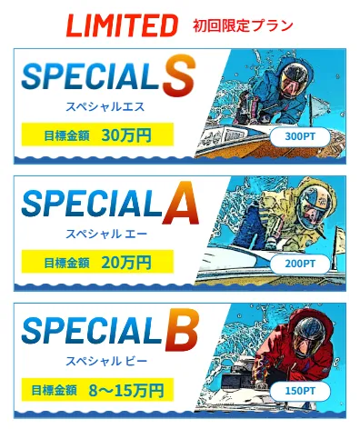 | スペシャルB | 1レース | 3連単 | 2~10点 | 15,000円 | 8~15万円 | 150PT | 初回限定 |
