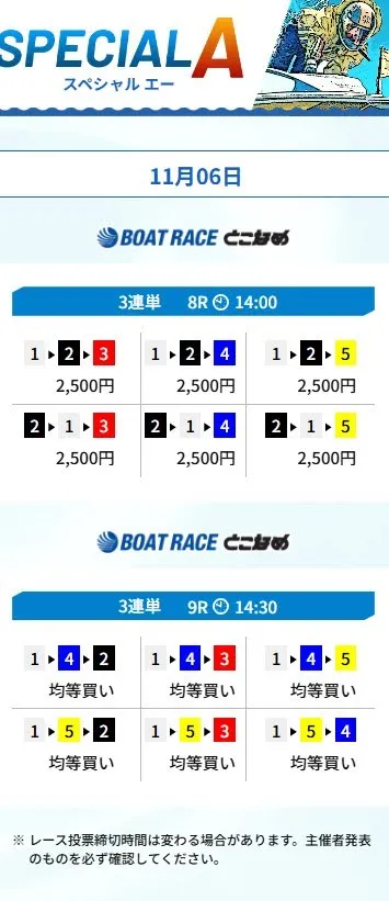 | スペシャルA | 2レースコロガシ | 3連単 | 2~10点 | 15,000円 | 20万円 | 200PT | 初回限定 |