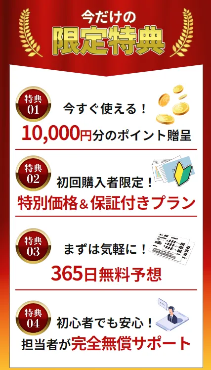 的中率の高い無料予想はもちろん、バリエーションに富んだ初回限定プランも魅力的で初心者だけでなく、中級者〜上級者でも満足のいく結果が得られることは間違いない。
