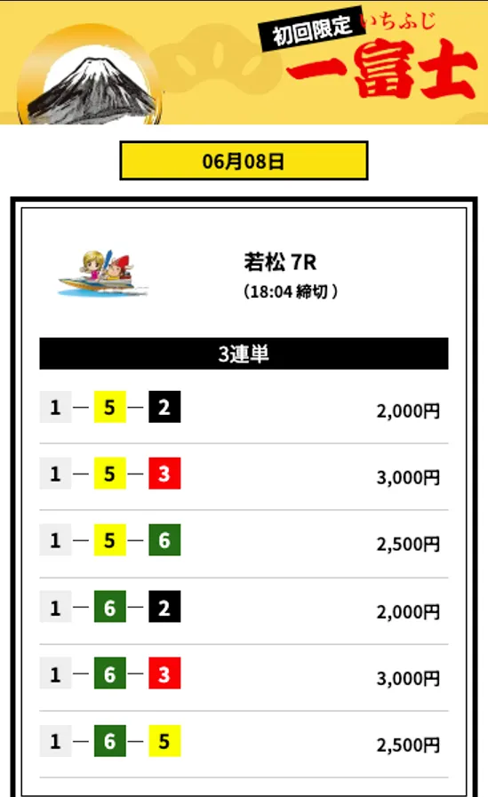 | 一富士 | 3連単2レース | 3~10点 | 15,000円 | 35万円~ | 250pt | 初回限定 |